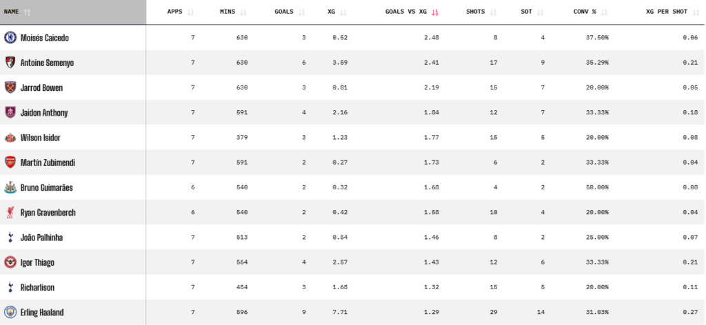 According to The Analyst’s Premier League database, a handful of forwards – including some unexpected names – are currently outperforming Haaland on xG per shot, conversion rate, and goal.