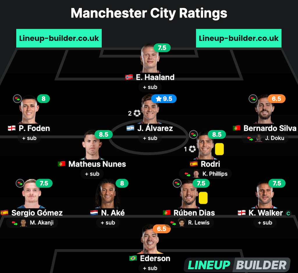 City would come out swinging to begin the second half through Álvarez who found a fully-deserved equalizer just two minutes after the restart after he skipped around Glazer from a tight angle at the near spot to slot home after being released by Haaland.